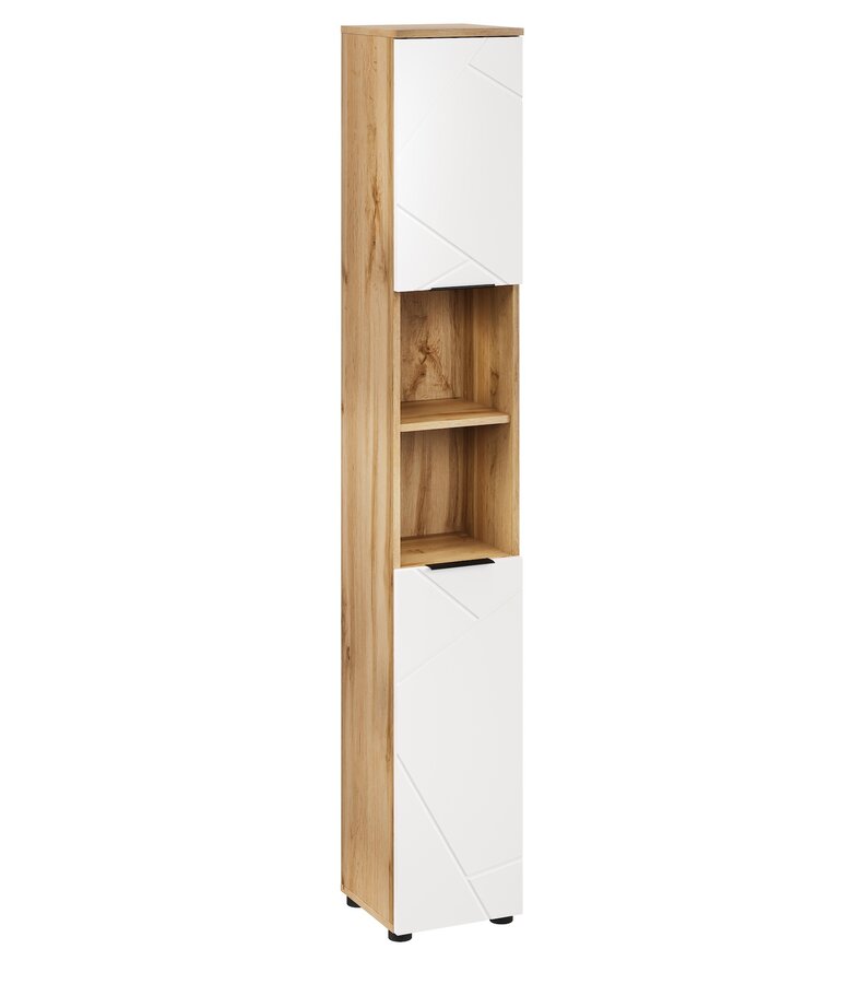 Staande badkamerkast Manello uitgevoerd met twee draaideuren en twee open vakken. De deuren van de kast kunnen linksdraaiend of rechtsdraaiend gemonteerd worden. Deze kast is gemaakt van spaanplaat met een fineerlaag, de 2 deuren zijn van MDF.