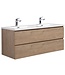 Badkamermeubel Angela 120cm inclusief onderkast en wastafel. De onderkast is voorgemonteerd en uitgevoerd met twee greeploze lades met soft close sluiting. Inclusief twee chromen afvoerpluggen voor de wastafel. De wastafelkranen en het sifon zijn niet inbegrepen. Het is mogelijk om de afvoer via de grond aan te sluiten. Aan de achterkant van de onderkast is aan de onderkant een uitsparing gemaakt van circa 6cm diep, over de gehele breedte. Dit is vanaf de zijkant niet zichtbaar, alleen vanaf de onderkant van de kast. De wastafel is gemaakt van kunstmarmer.