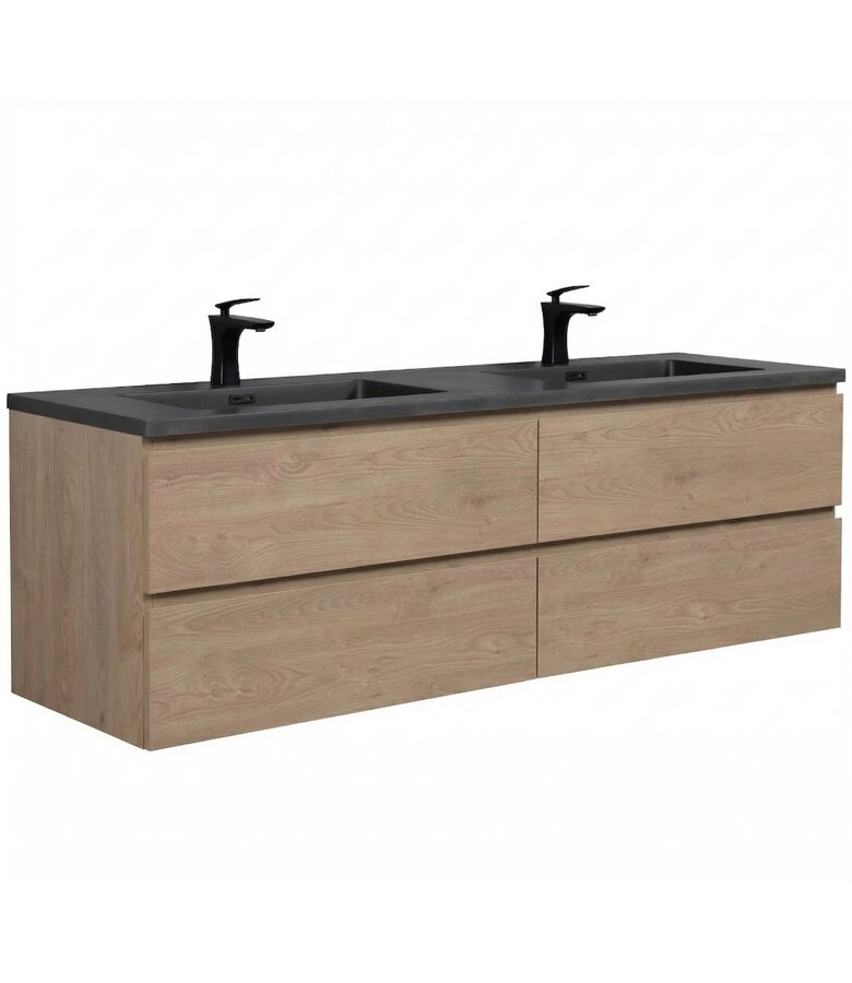 Badkamermeubel Angela 160cm inclusief onderkast en zwarte wastafel. De onderkast is voorgemonteerd en uitgevoerd met vier greeploze lades met soft close sluiting. Inclusief twee zwarte afvoerpluggen voor de wastafel. De wastafelkranen en het sifon zijn niet inbegrepen. Het is mogelijk om de afvoer via de grond aan te sluiten. Aan de achterkant van de onderkast is aan de onderkant een uitsparing gemaakt van circa 6cm diep, over de gehele breedte. Dit is vanaf de zijkant niet zichtbaar, alleen vanaf de onderkant van de kast. De wastafel is gemaakt van kunstmarmer.