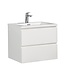 Badkamermeubel Angela 60cm inclusief onderkast en wastafel. De onderkast is voorgemonteerd en uitgevoerd met twee greeploze lades met soft close sluiting. Inclusief chromen afvoerplug voor de wastafel. De wastafelkraan en het sifon zijn niet inbegrepen. Het is mogelijk om de afvoer via de grond aan te sluiten. Aan de achterkant van de onderkast is aan de onderkant een uitsparing gemaakt van circa 6cm diep, over de gehele breedte. Dit is vanaf de zijkant niet zichtbaar, alleen vanaf de onderkant van de kast. De wastafel is gemaakt van kunstmarmer.