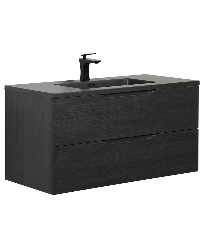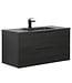 Badkamermeubel Cairo 100cm inclusief onderkast en zwarte wastafel. De onderkast is voorgemonteerd en uitgevoerd met twee lades met soft close sluiting. Inclusief afvoerplug voor de wastafel. De wastafelkraan en het sifon zijn niet inbegrepen. Het is mogelijk om de afvoer via de grond aan te sluiten. Aan de achterkant van de onderkast is aan de onderkant een uitsparing gemaakt van circa 6cm diep, over de gehele breedte. Dit is vanaf de zijkant niet zichtbaar, alleen vanaf de onderkant van de kast. De wastafel is gemaakt van kunstmarmer.
