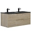 Badkamermeubel Cairo 120cm inclusief onderkast en dubbele zwarte wastafel. De onderkast is voorgemonteerd en uitgevoerd met twee lades met soft close sluiting. Inclusief afvoerpluggen voor de wastafel. De wastafelkraan en het sifon zijn niet inbegrepen. Het is mogelijk om de afvoer via de grond aan te sluiten. Aan de achterkant van de onderkast is aan de onderkant een uitsparing gemaakt van circa 6cm diep, over de gehele breedte. Dit is vanaf de zijkant niet zichtbaar, alleen vanaf de onderkant van de kast. De wastafel is gemaakt van kunstmarmer.