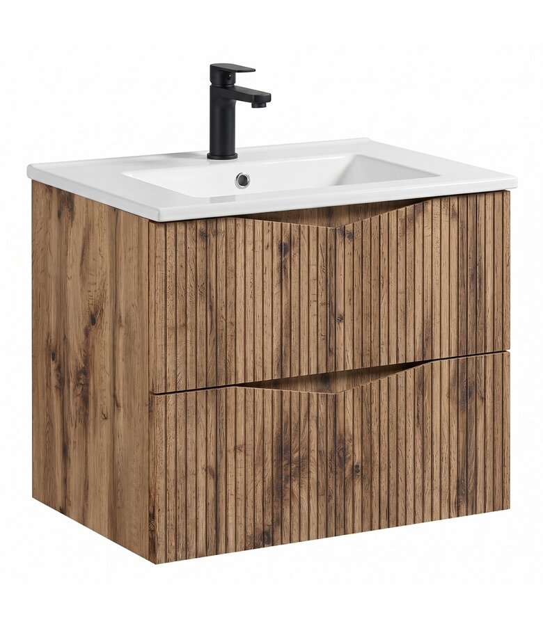 Badkamermeubel Calen is een badmeubelset inclusief wastafel. De twee lades van de onderkast zijn uitgevoerd met soft close sluiting. De Calen moet nog gemonteerd worden, alle montagematerialen en ophangmaterialen hiervoor zijn inbegrepen. Vanwege het formaat van de wastafel wordt aangeraden om een standaard afmeting wastafelkraan te gebruiken. Er wordt geen spiegel, wastafelkraan, afvoerplug of sifon meegeleverd. Een overloopset is wel bij de wastafel inbegrepen.