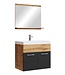 Badkamermeubel Montreal inclusief onderkast met wastafel en spiegel met planchet. De set is uitgevoerd in een eiken kleur met mat zwarte fronten. De Montreal moet zelf gemonteerd worden, alle montagematerialen en ophangmaterialen zijn inbegrepen. Vanwege het formaat van de wastafel wordt aangeraden om een standaard afmeting wastafelkraan te gebruiken. Er wordt geen wastafelkraan, afvoerplug of sifon meegeleverd. Een overloopset is wel bij de wastafel inbegrepen.
