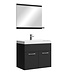 Badkamermeubel Montreal inclusief onderkast met wastafel en spiegel met planchet. De set is uitgevoerd in mat zwart. De Montreal moet zelf gemonteerd worden, alle montagematerialen en ophangmaterialen zijn inbegrepen. Vanwege het formaat van de wastafel wordt aangeraden om een standaard afmeting wastafelkraan te gebruiken. Er wordt geen wastafelkraan, afvoerplug of sifon meegeleverd. Een overloopset is wel bij de wastafel inbegrepen.