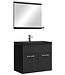 Badkamermeubel Montreal inclusief onderkast met zwarte wastafel en spiegel en planchet. De set is uitgevoerd in mat zwart. De Montreal moet zelf gemonteerd worden, alle montagematerialen en ophangmaterialen zijn inbegrepen. Vanwege het formaat van de wastafel wordt aangeraden om een standaard afmeting wastafelkraan te gebruiken. Er wordt geen wastafelkraan, afvoerplug of sifon meegeleverd. Een overloopset is wel bij de wastafel inbegrepen.