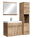 Badkamermeubel Montreal inclusief onderkast, witte wastafel, spiegel en zijkast. De set is uitgevoerd in een kastanje eiken kleur. De deuren van de zijkast zijn linksdraaiend of rechtsdraaiend te monteren. De Montreal moet nog gemonteerd worden, alle montagematerialen en ophangmaterialen zijn hiervoor inbegrepen. Vanwege het formaat van de wastafel wordt aangeraden om een standaard afmeting kraan te gebruiken. Er wordt geen wastafelkraan, afvoerplug of sifon meegeleverd. Een overloopset is wel bij het meubel inbegrepen.