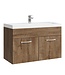 Badkamermeubel Paso met onderkast en wastafel. De set is uitgevoerd in een bruin eiken kleur. De Paso moet zelf gemonteerd worden, alle montagematerialen en ophangmaterialen zijn inbegrepen. Vanwege het formaat van de wastafel wordt aangeraden om een standaard afmeting wastafelkraan te gebruiken. Er wordt geen wastafelkraan, afvoerplug of sifon meegeleverd.