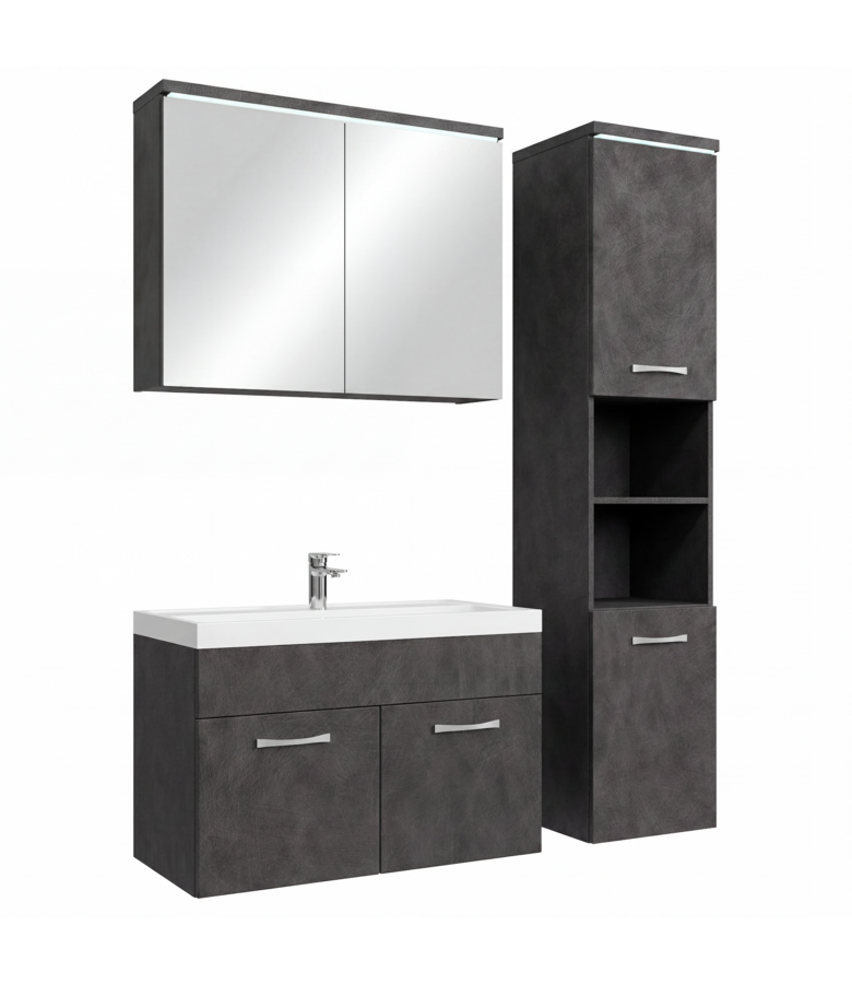 Badkamermeubel Paso inclusief onderkast, wastafel, spiegelkast en zijkast. De set is uitgevoerd in donker grijs. De deuren van de zijkast zijn linksdraaiend of rechtsdraaiend te monteren. De Paso moet nog gemonteerd worden, alle montagematerialen en ophangmaterialen zijn hiervoor inbegrepen. Vanwege het formaat van de wastafel wordt aangeraden om een standaard afmeting wastafelkraan te gebruiken. Er wordt geen wastafelkraan, afvoerplug of sifon meegeleverd. Een overloopset en LED verlichting zijn wel inbegrepen. Deze verlichting is sierverlichting en geen functioneel licht.