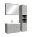 Badkamermeubel Paso inclusief onderkast, wastafel, spiegelkast en zijkast. De set is uitgevoerd in mat grijs. De deuren van de zijkast zijn linksdraaiend of rechtsdraaiend te monteren. De Paso moet zelf gemonteerd worden, alle montagematerialen en ophangmaterialen zijn inbegrepen. Vanwege het formaat van de wastafel wordt aangeraden om een standaard afmeting wastafelkraan te gebruiken. Er wordt geen wastafelkraan, afvoerplug of sifon meegeleverd. Een overloopset en LED verlichting zijn wel inbegrepen. Deze verlichting is sierverlichting en geen functioneel licht. De lampjes dienen achter de glasplaten in de bovenkanten van de kasten worden geschoven.