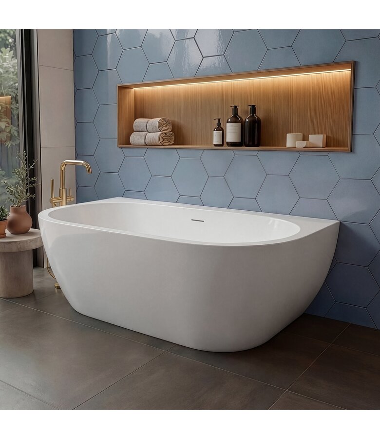 Vrijstaand ligbad Hanoi gemaakt van acryl met een hoogglans witte afwerking. Dankzij de vlakke achterkant kan dit model tegen de muur geplaatst worden.