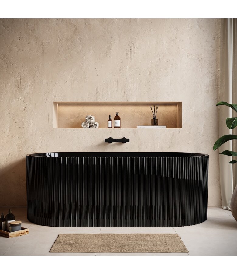 Vrijstaand ligbad Havana gemaakt van acryl met een hoogglans zwarte afwerking. Dankzij de vlakke achterkant kan dit model tegen de muur geplaatst worden.