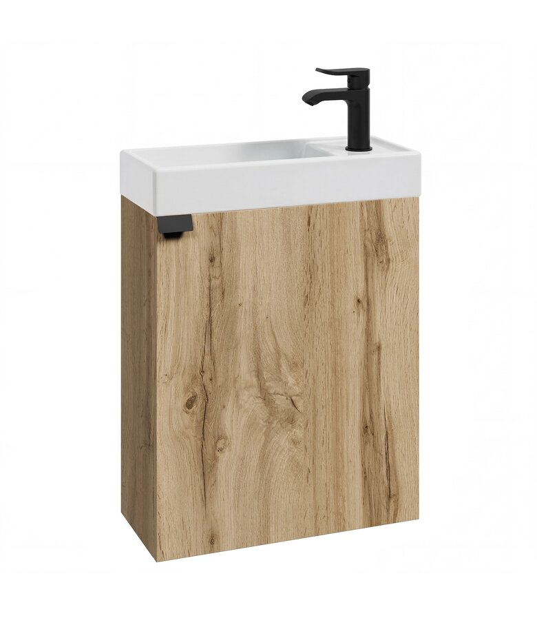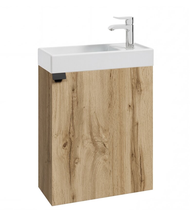 Toiletmeubel Keno inclusief onderkast en wastafel. Dit fonteinmeubel is bruikbaar zowel in de toiletruimtes als in de badkamer. De onderkast is uitgevoerd met een draaideur en zwarte handgreep, tijdens de montage kan worden gekozen om deze naar links of rechts open te laten draaien.