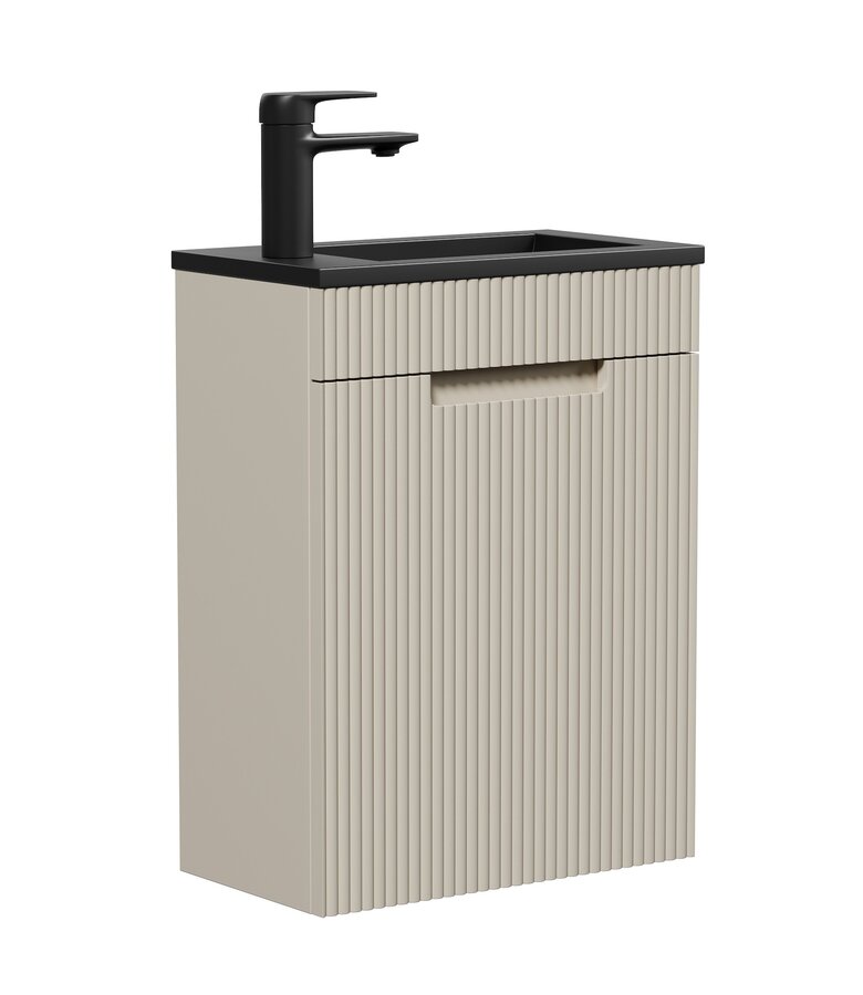Toiletmeubel Thermis is een compleet meubel inclusief onderkast en een zwarte wastafel. Dit fonteinmeubel is bruikbaar zowel in de toiletruimtes als in de badkamer. De onderkast is uitgevoerd met unieke ribbelstructuur en een deur met soft close sluiting.