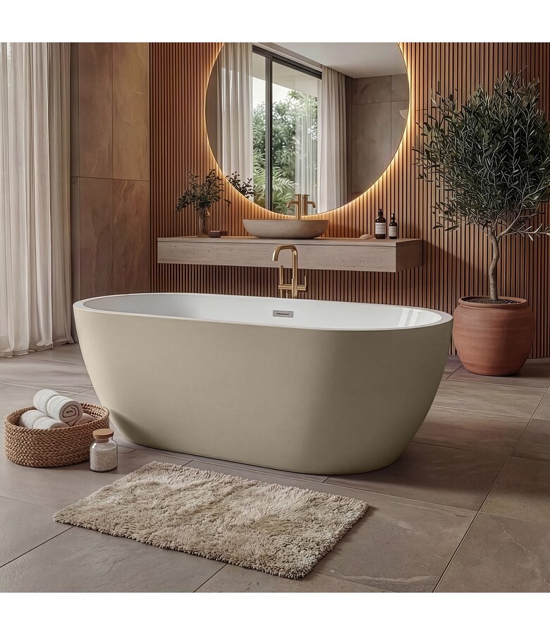 Vrijstaand ligbad Bahia gemaakt van acryl met een mat beige buitenkant en mat witte binnenkant. Dit model kan vrijstaand geplaatst worden.