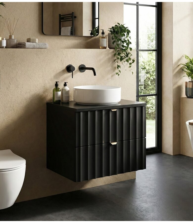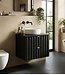 Wastafelkast Azore is een onderkast met bovenblad. De onderkast is uitgevoerd met twee lades en gouden handgrepen. Inclusief bijbehorend montagemateriaal en bevestigingsmateriaal om de kast te monteren en aan de muur op te hangen.