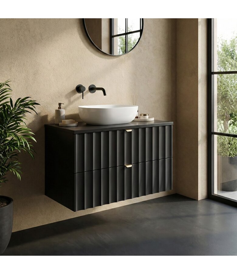 Wastafelkast Azore is een onderkast met bovenblad. De onderkast is uitgevoerd met twee lades en gouden handgrepen. Inclusief bijbehorend montagemateriaal en bevestigingsmateriaal om de kast te monteren en aan de muur op te hangen.