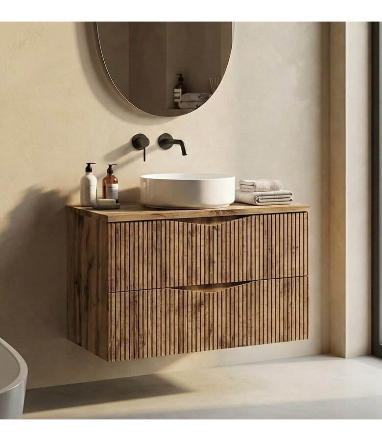 Wastafelkast Calen is een onderkast met bovenblad. De onderkast is uitgevoerd met twee lades en soft-close. Inclusief bijbehorend montagemateriaal en bevestigingsmateriaal om de kast te monteren en aan de muur op te hangen.